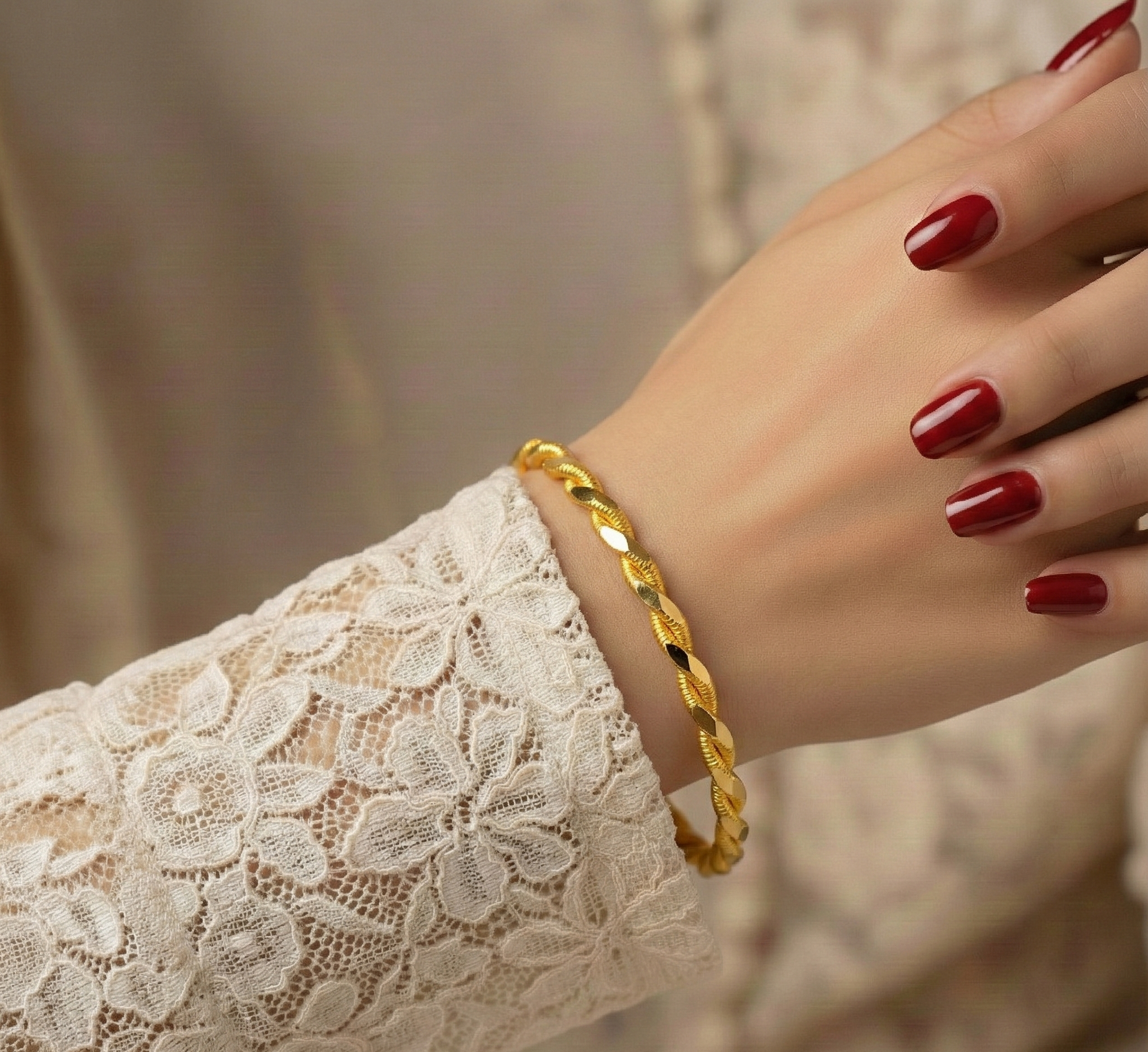 Gerçek altın görünümü sunan 22 ayar kaplama burma bilezikler, hem şık bir aksesuar hem de uzun ömürlü kullanım için ideal bir seçenekti